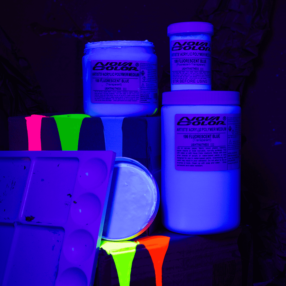Our Fluorescent Blue acrylic paint not only has an incredible pigment, but it also offers great coverage, outstanding color brilliance, and exceptional brushability that makes it lovely to work with. This shade of fluorescent blue professional acrylic paint adds instant fluorescence to any art project, from paintings and outdoor murals to furniture remodels.