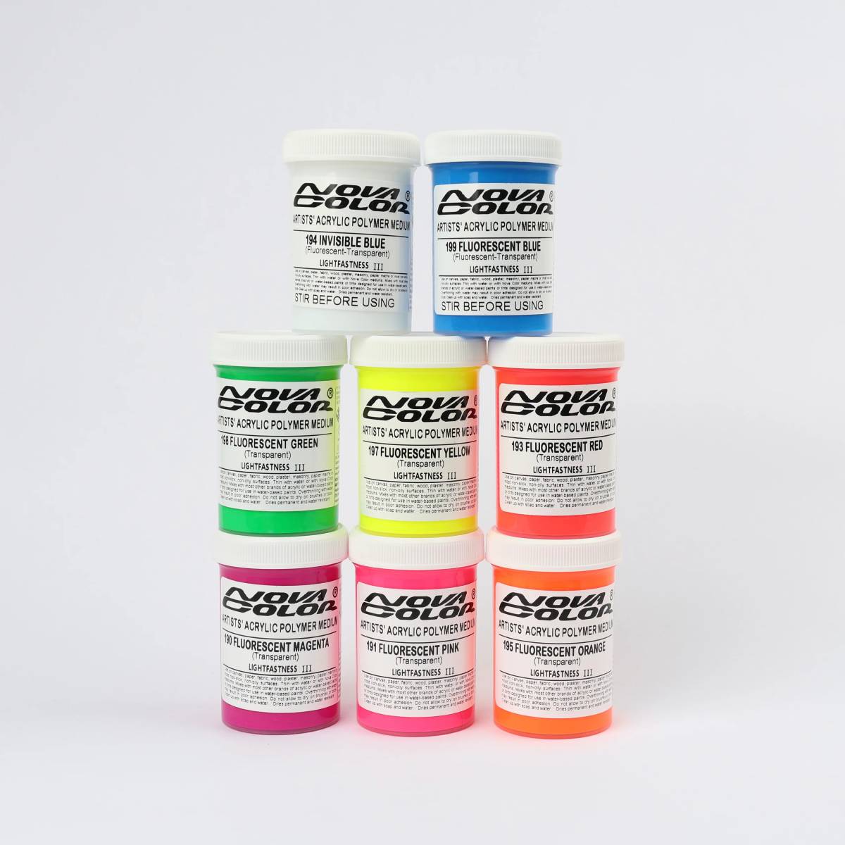 Bold, vibrant and designed to fluoresce the Nova Color Fluorescent Bundle is here to make your work light up any room! These 4 ounce containers hold the perfect amount to satisfy any artist’s desire for vivid color. All of these colors are mixed to perfection and are the same medium-body consistency one can expect from all Nova Color Paints!